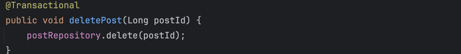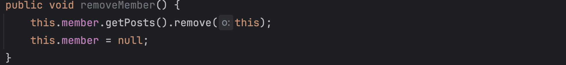 Post를 삭제하기 전에 Post와 Member의 연관 관계를 끊지 않으면, Member가 여전히 영속성 컨텍스트에서 관리되기 때문에 JPA는 Post 삭제를 보류한다. 이 경우 delete 쿼리는 쓰기 지연 저장소에 추가되지만, Post 엔티티가 Member와의 연관 관계로 인해 삭제 가능한 상태로 간주되지 않아 실제 쿼리가 실행되지 않는다.